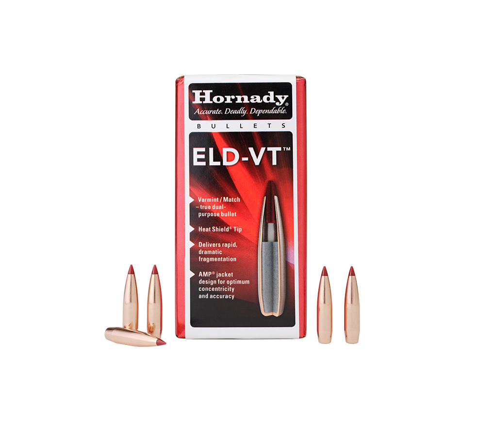 Product Features HEAT SHIELD TECHNOLOGY ELD-VT bullets incorporate the Heat Shield tip, which resists the effects of aerodynamic heating. They retain their shape to maintain the lowest drag over their entire trajectory. ADVANCED MANUFACTURING PROCESS (AMP) BULLET JACKETS A testament to an unwavering commitment to excellence, AMP bullet jackets provide unrivalled consistency in concentricity and thickness, ensuring every ELD-VT bullet performs at its peak. RAPID FRAGMENTATION The Hornady ELD-VT bullet isn’t just about hitting the bullseye it’s about making a statement when it gets there.Upon impact, the polymer tip drives rearward through the large air gap and into the bullet core, causing rapid and dramatic fragmentation, even at low velocity. PRECISION PERFORMANCE Born from a culmination of years of ballistic research, the ELD-VT pairs the aerodynamics of low-drag match bullets with the lighter weight of a varmint bullet, giving the ELD-VT a level of uncompromising dual-purpose performance. Say goodbye to compromise, as this bullet’s match-winning accuracy and rapid expansion will set new standards. UNIQUE WEIGHT TO LENGTH DESIGN Long, sleek, match bullet profile with reduced core-to-bullet length ratio maximises muzzle velocity and moves the centre of gravity rearward which enhances aerodynamic performance.